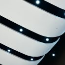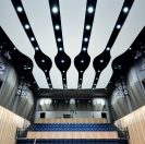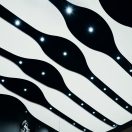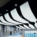 Armstrong also developed prototype molds and prioritized repetition to keep costs down. Despite complex geometry and varying curves and widths, Armstrong utilized just 16 molds, casting 190 GRG panels to create the ceiling ribbons and walls. The spacing between the ribbons was calculated to meet requirements for acoustics, allowing sound to reflect or pass through the ceiling to enhance the performance. Spaces also created the illusion of darkness, offering the desired bold visual contrast to the clean, white GRG ceiling panels.