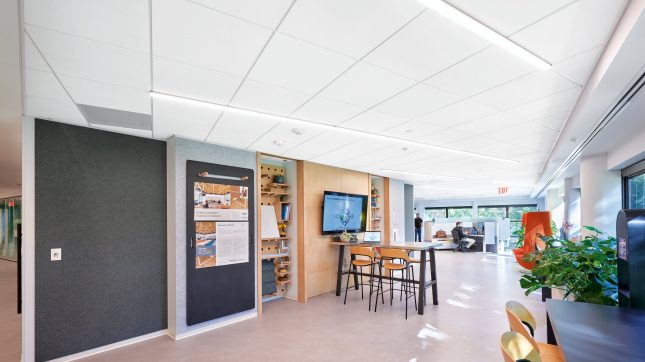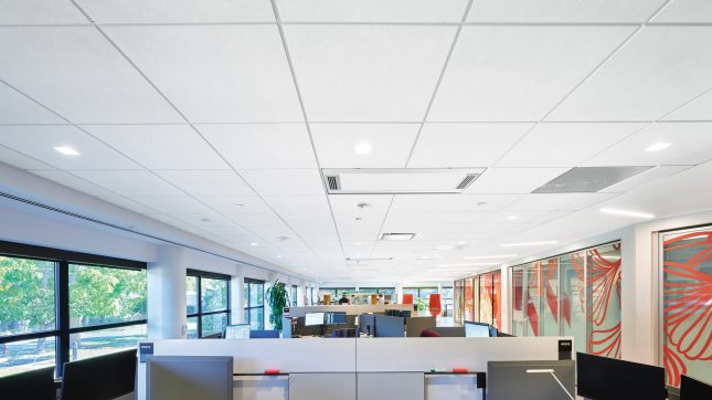 Installing ceiling tiles backed with phase change material (PCM) technology contribute to a more comfortable environment while decreasing energy consumption. The primary benefits include temperature regulation, reduced hot/hold complaints, reduced heating and cooling costs, and more efficient HVAC operations.