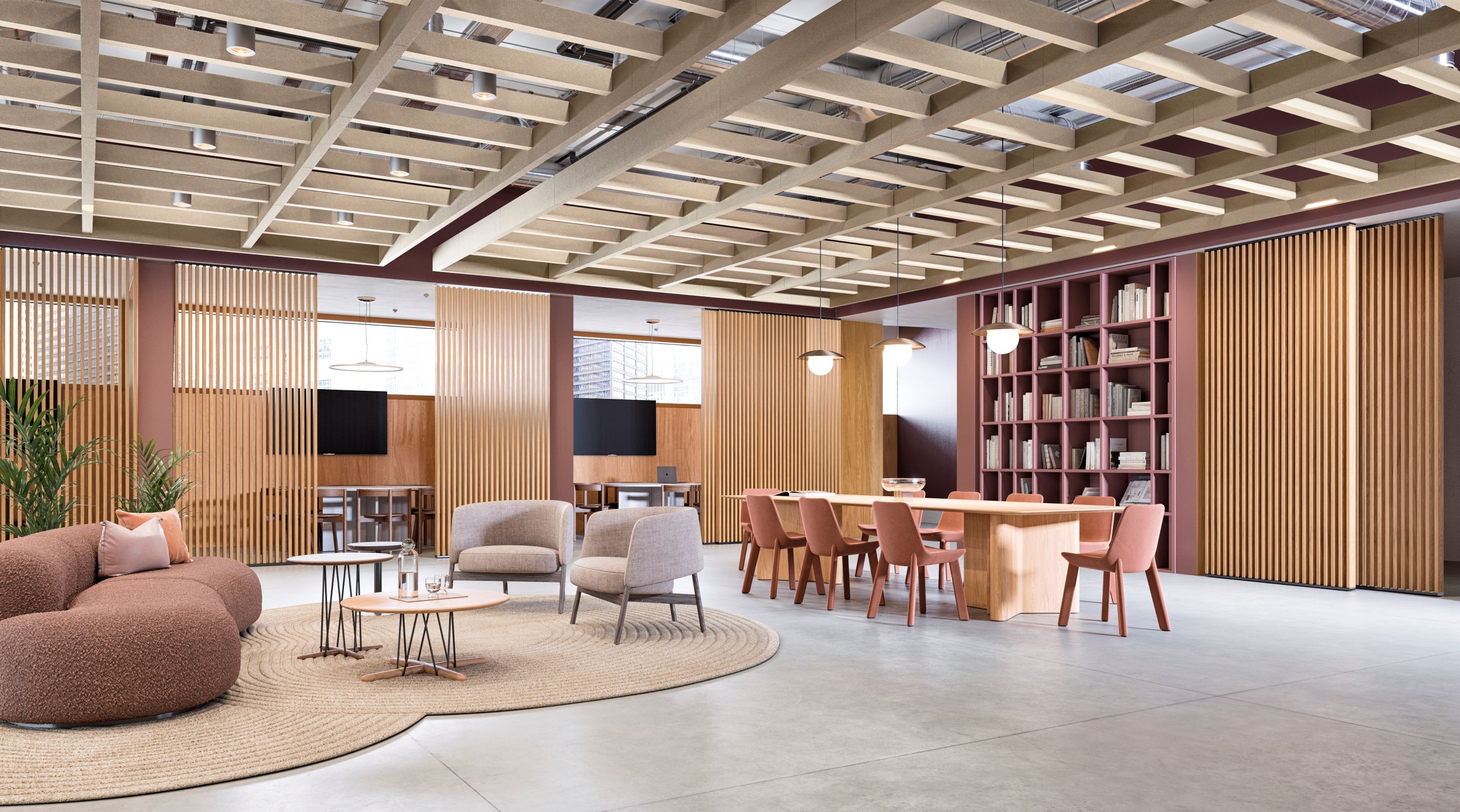 LANCASTER, Pa. (March 5, 2026) — Armstrong World Industries, Inc., a leader in the design and manufacture of innovative interior and exterior architectural applications including ceilings, specialty walls, and exterior metal solutions, has launched WOODWORKS Definitions Custom Grille Partition System. This custom partition solution offers architects and designers the opportunity to create one-of-a-kind, nature-inspired visuals while meeting the functional needs of a wide range of multi-use spaces. Integrating the warmth and biophilic benefits of wood visuals with precision definition of grille panels, WOODWORKS Definitions Custom Grille Partitions are especially well-suited for high-end environments, ranging from corporate headquarters to boutique hotels and luxury retail locations.