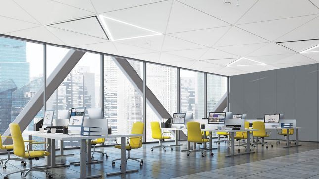 Contemporary ceiling makes a dramatic impact in updated interior space using the PROJECTWORKS design-to-installation service.